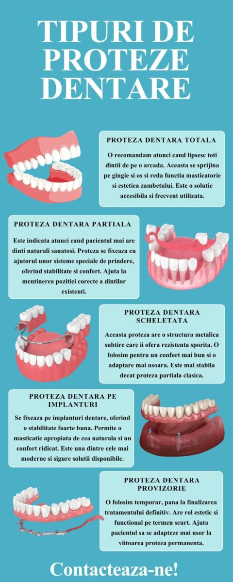 – totale – inlocuiesc toti dintii de pe o arcada; – partiale – inlocuiesc o parte din dintii de pe o arcada; – scheletate – au baza metalica si ofera o stabilitate mai buna; – pe implanturi – se fixeaza pe implanturile dentare. |